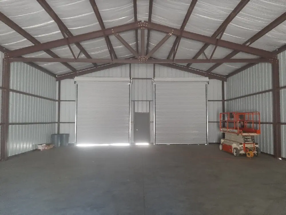 All structural members are high strength 57,000 psi steel, cut to length, and pre-punched for easy assembly with either 1/2″ bolts or self-drilling screws. Roof and Wall panels are 26ga. 80,000 psi painted galvanized steel. All roof and wall panels are attached with self-drilling fasteners. Panel fasteners are color matched. All panel laps are fastened with self-drilling fasteners. Roofing side laps receive roll mastic sealant. Gable